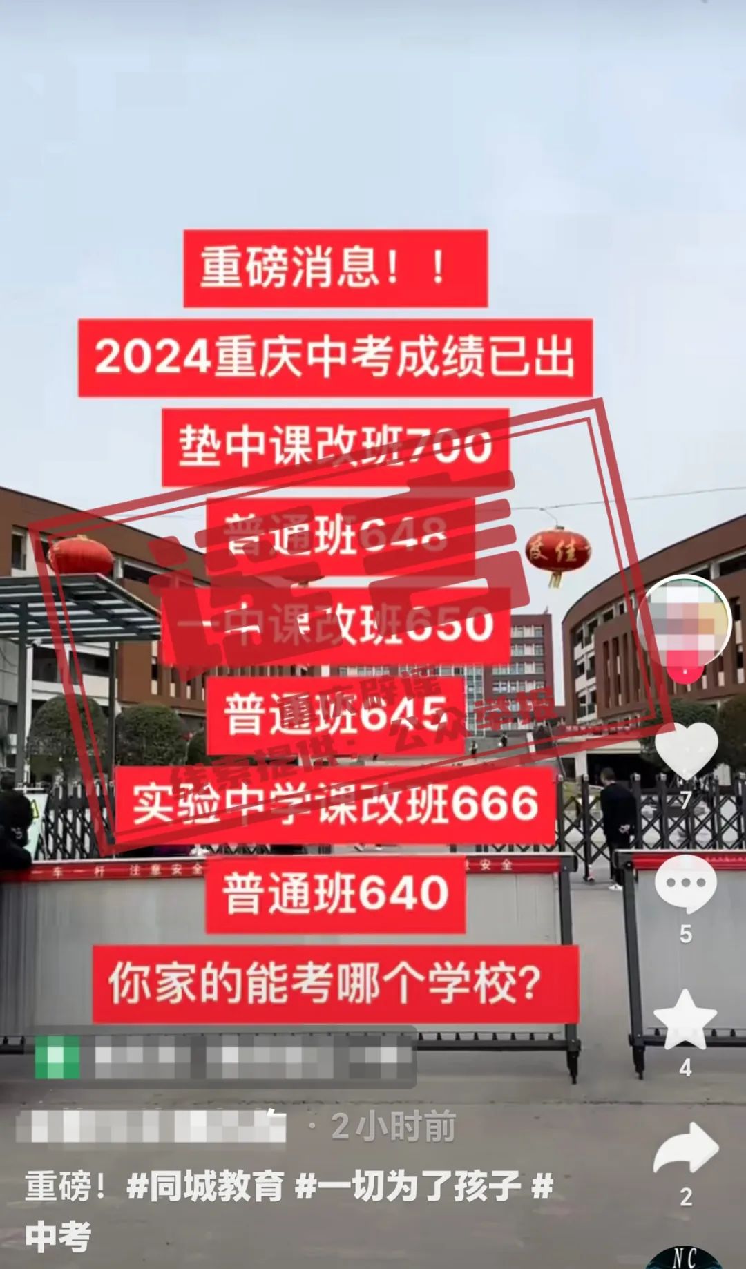 6月14日,某账号发布视频,称“2024重庆中考成绩已出”“垫中课改班700、一中课改班650、实验中学课改班666”。经核查,该信息系谣言。