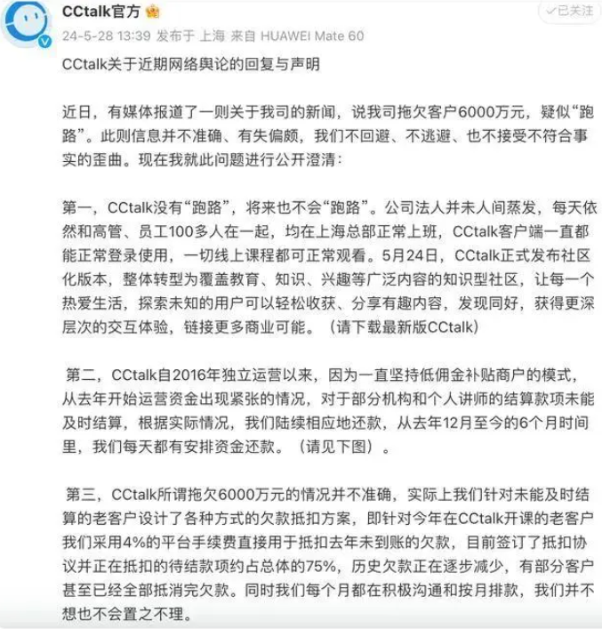 CCtalk在声明中称,没有“跑路”,将来也不会“跑路”,公司法人、高管及员工100多人均在上海总部正常上班。CCtalk在声明中承认从上一年开端运营资金呈现紧张的状况,关于部分组织和个人讲师的结算款项未能及时结算,“依据实际状况,咱们连续相应地还款”。